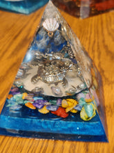 This handmade orgonite pyramid contains Amazonite.  Each of our pyramids also has a clear quartz crystal wrapped in metal in the tip. Orgonite is created through the process of mixing polyester resin, crystals, and metal. When the resin hardens it shrinks and puts pressure on the crystal. This pressure changes the polarity of the crystal creating a piezoelectric effect on surrounding dirty/chaotic EMFs, electro magnetic frequencies. This effect harmonizes negative EMFs, or DOR into positive EMFs, or POR. The field this piece creates is 12-16 feet. The base is about 4.25 inches