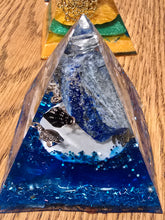 This handmade orgonite pyramid contains Lapis Lazuli. Each of our pyramids also has a clear quartz crystal wrapped in metal in the tip. Orgonite is created through the process of mixing polyester resin, crystals, and metal. When the resin hardens it shrinks and puts pressure on the crystal. This pressure changes the polarity of the crystal creating a piezoelectric effect on surrounding dirty/chaotic EMFs, electro magnetic frequencies. This effect harmonizes negative EMFs, or DOR into positive EMFs, or POR. The field this piece creates is 4-6 feet. The base is about 3 inches