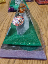 This handmade orgonite pyramid contains the stone of Amethyst.  Each of our pyramids also has a clear quartz crystal wrapped in metal in the tip. Orgonite is created through the process of mixing polyester resin, crystals, and metal. When the resin hardens it shrinks and puts pressure on the crystal. This pressure changes the polarity of the crystal creating a piezoelectric effect on surrounding dirty/chaotic EMFs, electro magnetic frequencies. This effect harmonizes negative EMFs, or DOR into positive EMFs, or POR. The field this piece creates is 8-10 feet. The base is about 3.5 inches