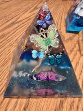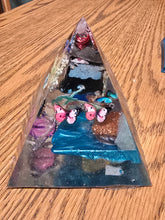 This handmade orgonite pyramid contains Black Obsidian stones. Each of our pyramids also has a clear quartz crystal wrapped in metal in the tip. Orgonite is created through the process of mixing polyester resin, crystals, and metal. When the resin hardens it shrinks and puts pressure on the crystal. This pressure changes the polarity of the crystal creating a piezoelectric effect on surrounding dirty/chaotic EMFs, electro magnetic frequencies. This effect harmonizes negative EMFs, or DOR into positive EMFs, or POR. The field this piece creates is 8-10 feet. The base is about 3.5 inches