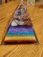 This handmade orgonite pyramid contains 7 stones, one for each chakra. Each of our pyramids also has a clear quartz crystal wrapped in metal in the tip. Orgonite is created through the process of mixing polyester resin, crystals, and metal. When the resin hardens it shrinks and puts pressure on the crystal. This pressure changes the polarity of the crystal creating a piezoelectric effect on surrounding dirty/chaotic EMFs, electro magnetic frequencies. This effect harmonizes negative EMFs, or DOR into positive EMFs, or POR. The field this piece creates is 14-18 feet. The base is about 4.75 inches