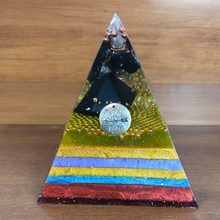 This handmade orgonite pyramid contains Amazonite. Each of our pyramids also has a clear quartz crystal wrapped in metal in the tip. Orgonite is created through the process of mixing polyester resin, crystals, and metal. When the resin hardens it shrinks and puts pressure on the crystal. This pressure changes the polarity of the crystal creating a piezoelectric effect on surrounding dirty/chaotic EMFs, electro magnetic frequencies. This effect harmonizes negative EMFs, or DOR into positive EMFs, or POR. The field this piece creates is 14-18 feet. The base is about 4.75 inches